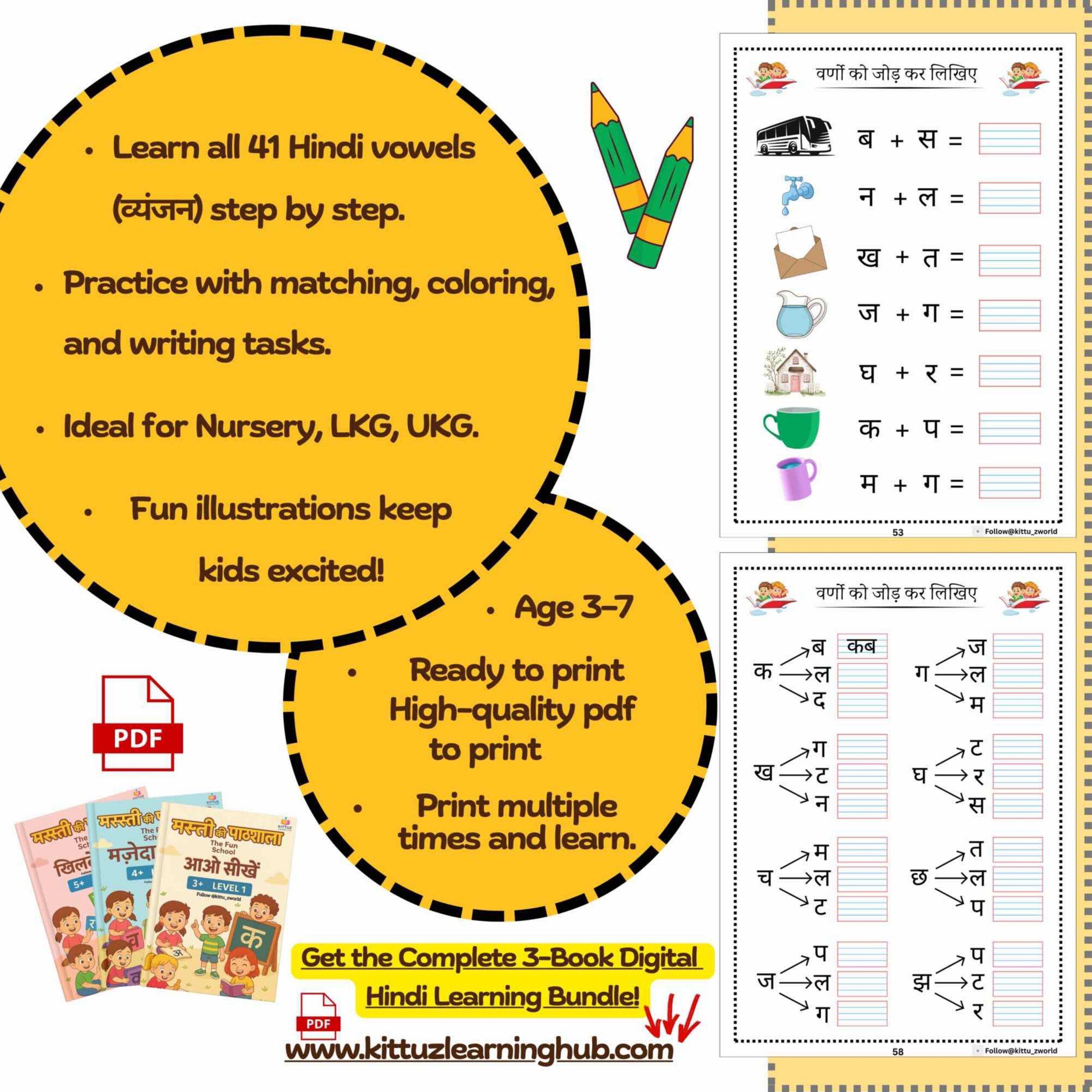A colorful, fun-filled Hindi workbook for early learners (ages 4+). मस्ती की पाठशाला – Level 2 introduces children to Hindi vowels (स्वर) like अ, आ, इ, ई through engaging activities such as tracing, coloring, and circle-the-correct-letter games. Designed to build reading and writing readiness, this interactive book turns language learning into joyful playtime — perfect for preschool and kindergarten kids!