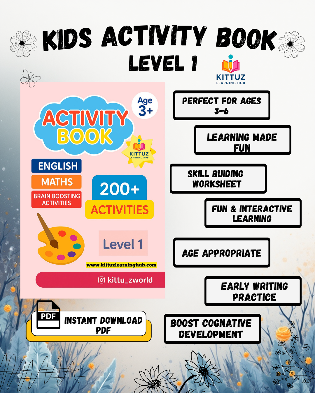 Introduce your child to fun, engaging, and interactive learning with the Kids Activity Book – Level 1 by Kittuz Learning Hub. This beautifully designed 50-page printable PDF includes 200+ activities that help build early skills in a playful way.