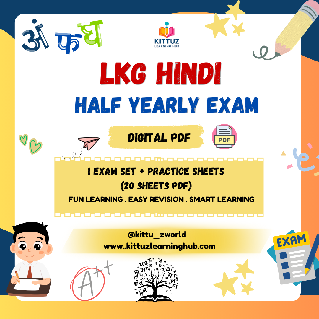 Build strong Hindi foundations and help your child prepare confidently for the LKG Hindi Half Yearly Exam with this engaging 20-page Digital PDF worksheet pack. This bundle includes one complete exam paper along with extra practice sheets, designed to make Hindi learning simple, fun, and effective for early learners.