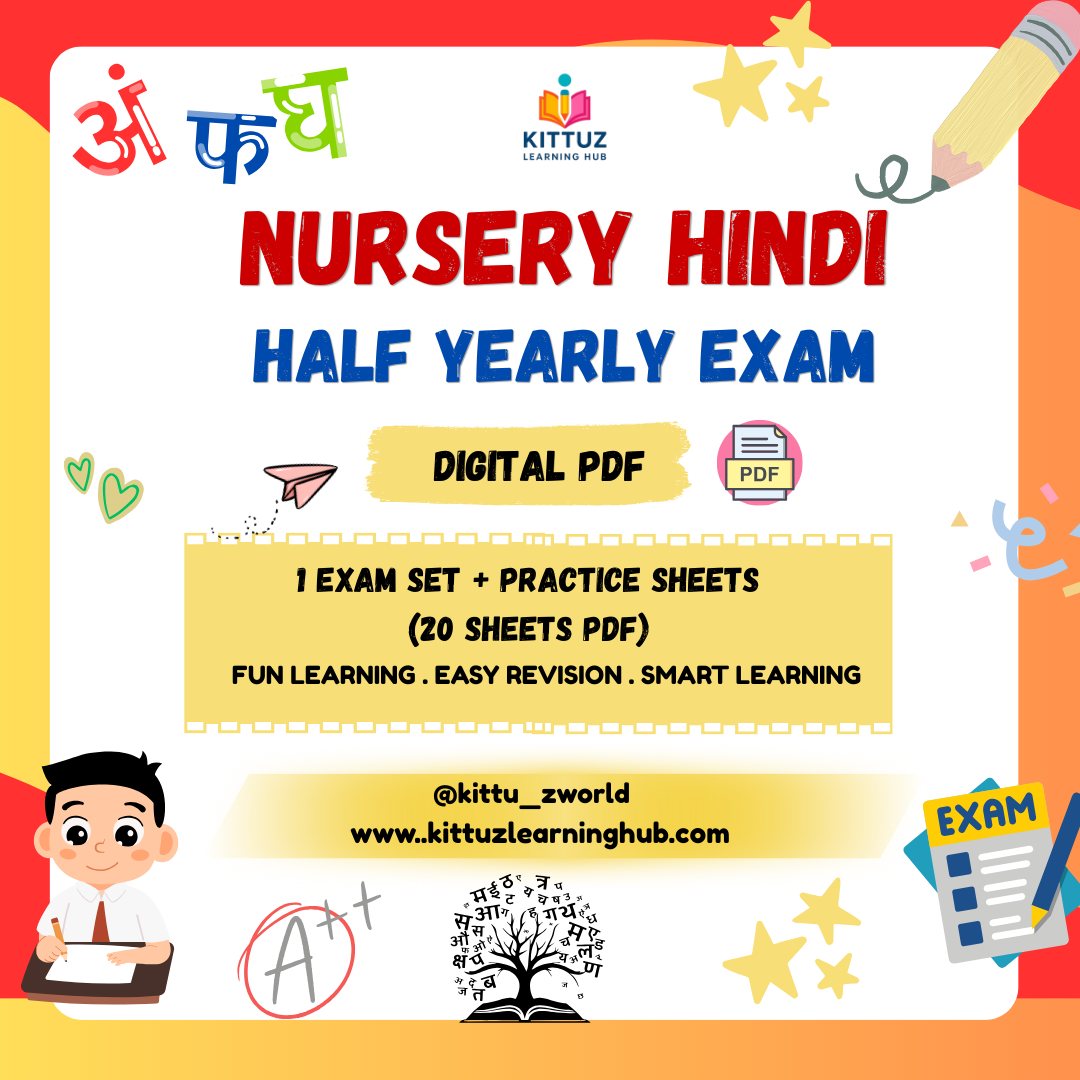 Help your nursery child revise and prepare confidently with our Nursery Hindi Half Yearly Exam Digital PDF. This bundle includes 1 complete exam paper + 20 practice worksheets, specially designed to build strong Hindi basics through engaging and child-friendly activities.