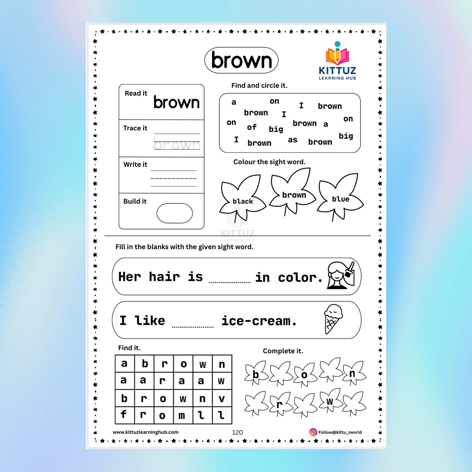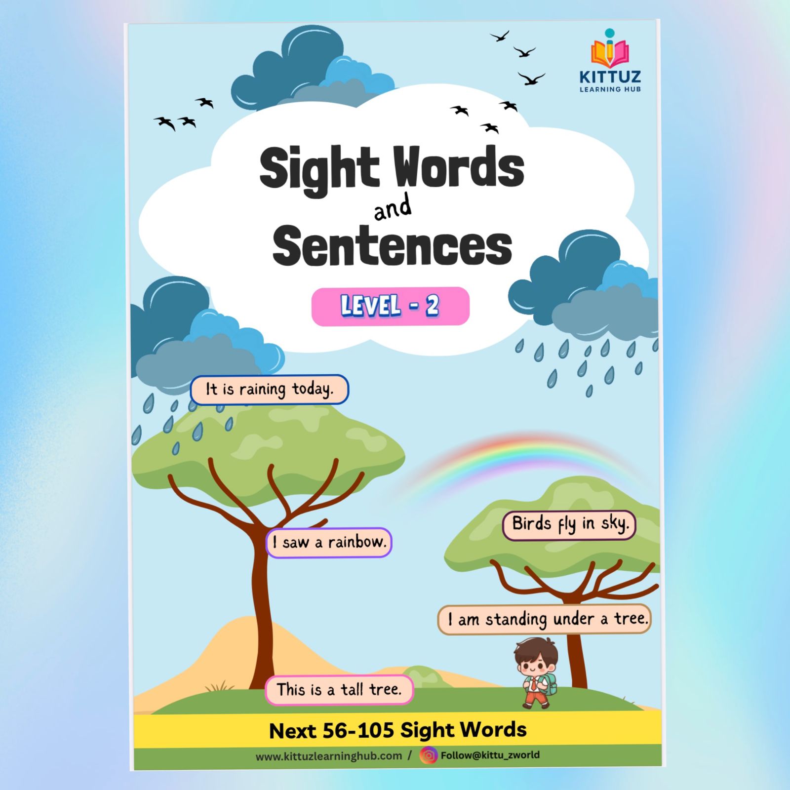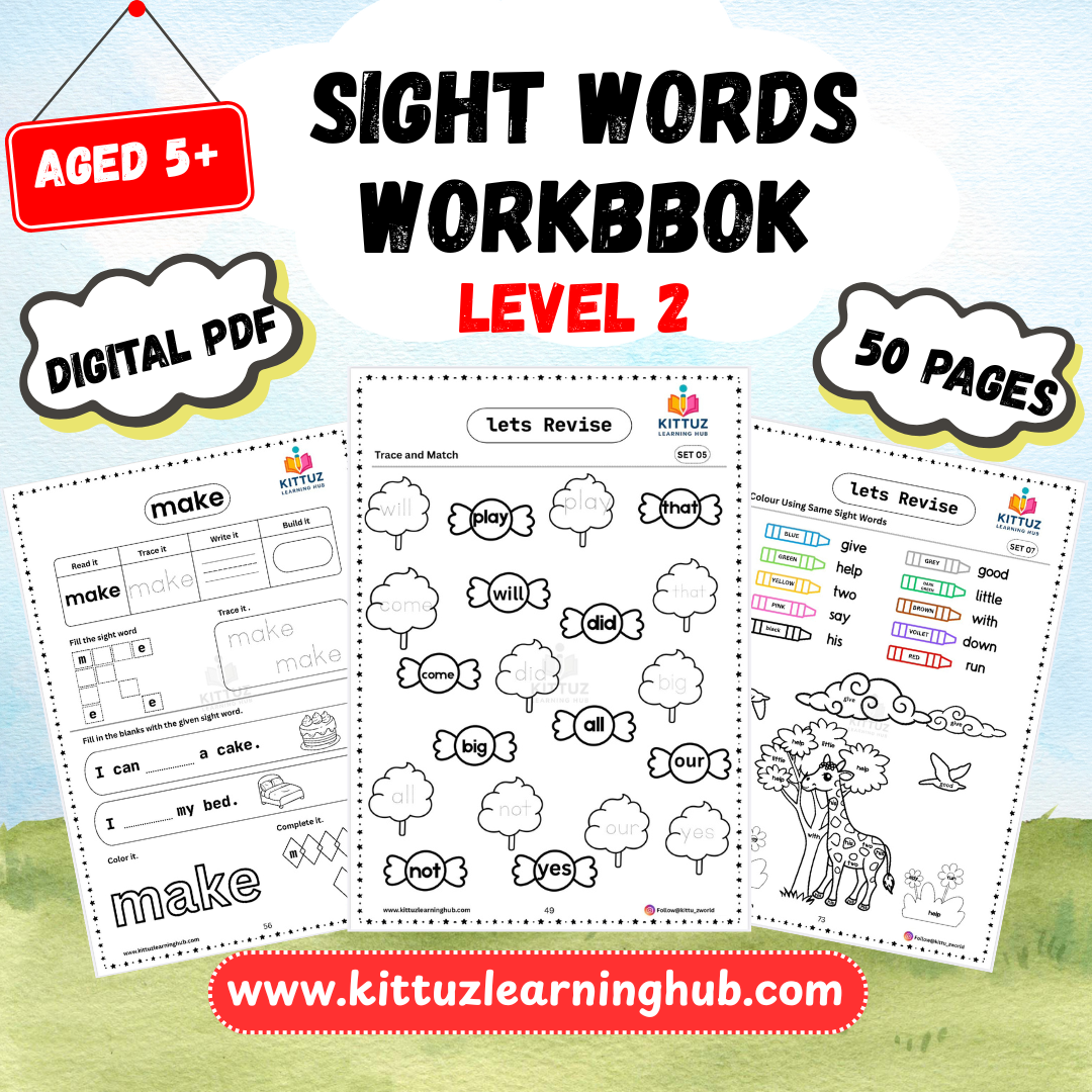 Help your early learner master sight words confidently with this Sight Words & Sentences Level-2 Worksheet Bundle. Designed for Nursery, LKG, UKG and Kindergarten, this pack covers 50 essential sight words (56–105) through engaging and child-friendly activities.