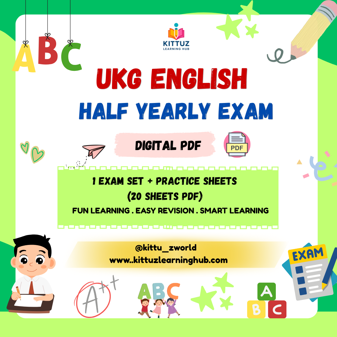 Boost your child’s confidence and exam readiness with our UKG English Half Yearly Exam PDF Pack. This digital bundle includes 1 complete exam set + 20 engaging practice worksheets, designed to strengthen essential English skills for UKG students.